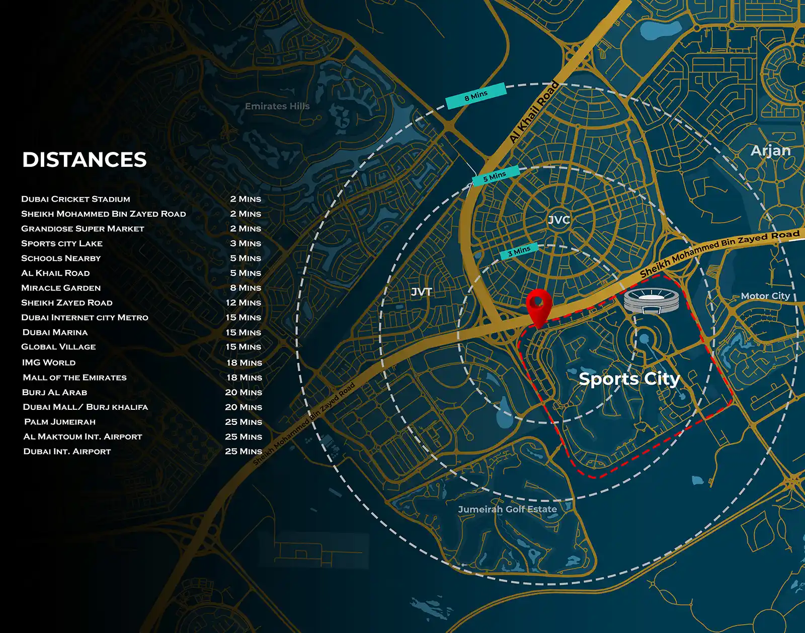 Aspirez is located in Dubai Sports City with easy access to Sheikh Mohammed Bin Zayed Road. It’s just 10–15 minutes from Dubai Marina, Mall of the Emirates, and Downtown Dubai, with schools, malls, and sports venues nearby.